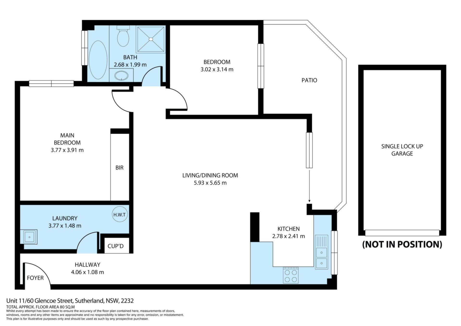 Two well-sized bedrooms, main with built-in wardrobe Spacious, updated kitchen with ample cupboard space Generous open plan lounge and dining area Private balcony off the living space – ideal for relaxing or entertaining Neat and tidy bathroom with separate bath and shower and brand new vanity Internal laundry for added convenience Secure lock-up garage